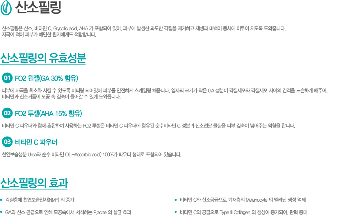 1. O2 Peel »ê¼ÒÇʸµÀº »ê¼Ò, ºñŸ¹Î C, Glycolic acid, AHA °¡ Æ÷ÇԵǾî ÀÖ¾î, ÇǺο¡ ¹ß»ýÇÑ °úµµÇÑ °¢ÁúÀ» Á¦°ÅÇϰí Àç»ý°ú ¹Ì¹éÀÌ µ¿½Ã¿¡ ÀÌ·ç¾î Áöµµ·Ï µµ¿ÍÁÝ´Ï´Ù. ÀÚ±ØÀÌ Àû¾î ÇǺΰ¡ ¿¹¹ÎÇÑ È¯ÀÚ¿¡°Ôµµ ÀûÇÕÇÕ´Ï´Ù. O2 Peel ÀÇ À¯È¿¼ººÐ FO2 ¿øÁ©(GA 30% ÇÔÀ¯) ÇǺο¡ ÀÚ±ØÀ» ÃÖ¼ÒÈ ½Ãų ¼ö ÀÖµµ·Ï ¹öÆÛ¸µ µÇ¾îÀÖ¾î ÇǺθ¦ ¾ÈÀüÇÏ°Ô ½ºÄÉÀϸµ ÇØÁÝ´Ï´Ù. ÀÔÀÚÀÇ Å©±â°¡ ÀÛÀº GA ¼ººÐÀÌ °¢Áú¼¼Æ÷¿Í °¢Áú¼¼Æ÷ »çÀÌÀÇ °£°ÝÀ» ´À½¼ÇÏ°Ô ÇØÁÖ¾î, ºñŸ¹Î°ú »ê¼Ò°ÅǰÀÌ ¸ð°ø ¼Ó ±í¼÷ÀÌ µé¾î°¥ ¼ö ÀÖ°Ô µµ¿ÍÁÝ´Ï´Ù. FO2 ÅõÁ©(AHA 15% ÇÔÀ¯) ºñŸ¹Î C ÆÄ¿ì´õ¿Í ÇÔ²² È¥ÇÕÇÏ¿© »ç¿ëÇÏ´Â FO2 ÅõÁ©Àº ºñŸ¹Î C ÆÄ¿ì´õ¿¡ ÇÔÀ¯µÈ ¼ø¼öºñŸ¹Î C ¼ººÐ°ú »ê¼ÒÀü´Þ ¹°ÁúÀ» ÇǺΠ±í¼÷ÀÌ ³Ö¾îÁÖ´Â ¿ªÇÒÀ» ÇÕ´Ï´Ù. ºñŸ¹Î C ÆÄ¿ì´õ õ¿¬º¸½À¼ººÐ Urea¿Í ¼ø¼ö ºñŸ¹Î C(L-Ascorbic acid) 100%°¡ ÆÄ¿ì´õ ÇüÅ·ΠÆ÷ÇԵǾî ÀÖ½À´Ï´Ù. O2 Peel ÀÇ È¿°ú 1) °¢ÁúÃþ¿¡ õ¿¬º¸½ÀÀÎÀÚ(NMF) ÀÇ Áõ°¡ 2) GA¿Í »ê¼Ò °ø±ÞÀ¸·Î ÀÎÇØ ¸ð°ø¼Ó¿¡¼ ¼½ÄÇÏ´Â P.acne ÀÇ »ì±Õ È¿°ú 3) ºñŸ¹Î C¿Í »ê¼Ò°ø±ÞÀ¸·Î ±âÀúÃþÀÇ Melanocyte ÀÇ ¸á¶ó´Ñ »ý¼º ¾ïÁ¦ 4) ºñŸ¹Î CÀÇ °ø±ÞÀ¸·Î Type III Collagen ÀÇ »ý¼ºÀÌ Áõ°¡µÇ¾î, ź·Â Áõ´ë