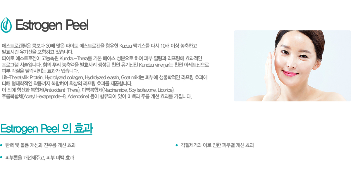 2. Estrogen Peel ? ¿¡½ºÆ®·Î°ÕÇÊÀº ÄẸ´Ù 30¹è ¸¹Àº ÆÄÀÌÅä ¿¡½ºÆ®·Î°ÕÀ» ÇÔÀ¯ÇÑ Kudzu ¾×±â½º¸¦ ´Ù½Ã 10¹è ÀÌ»ó ³óÃàÇÏ°í ¹ßÈ¿½ÃŲ À¯±â»êÀ» Æ÷ÇÔÇϰí ÀÖ½À´Ï´Ù. ? ÆÄÀÌÅä ¿¡½ºÆ®·Î°ÕÀÌ °í³óÃàµÈ Kundzu-Thera¸¦ ±âº» º£À̽º ¼ººÐÀ¸·Î ÇÏ¿© ÇǺΠÇʸµ°ú ¸®ÇÁÆÃ¿¡ È¿°úÀûÀÎ ÇÁ·Î±×·¥ ½Ã¼úÀÔ´Ï´Ù. ? ĦÀÇ »Ñ¸® ³óÃà¾×À» ¹ßÈ¿½ÃÄÑ »ý¼ºµÈ õ¿¬ À¯±â»êÀÎ Kundzu vinegar´Â õ¿¬ ¾Æ¼¼Æ®»êÀ¸·Î ÇǺΠ°¢ÁúÀ» Å»¶ô½ÃŰ´Â È¿°ú°¡ ÀÖ½À´Ï´Ù. ? Lift-Thera(Milk Protein, Hydrolyzed collagen, Hydrolyzed elastin, Goat milk)´Â ÇǺο¡ »ý¹°ÇÐÀûÀÎ ¸®ÇÁÆÃ È¿°ú¿¡ ´õÇØ ÇüÅÂÇÐÀûÀÎ ÀÛ¿ë±îÁö º¹ÇÕÇÏ¿© ÃÖ»óÀÇ ¸®ÇÁÆÃ È¿°ú¸¦ Á¦°øÇÕ´Ï´Ù. ? ÀÌ ¿Ü¿¡ Ç×»êÈ º¹ÇÕÁ¦(Antioxidant-Thera), ¹Ì¹éº¹ÇÕü(Niacinamide, Soy Isoflavone, Licorice), ÁÖ¸§º¹ÇÕü(Acetyl Hexapeptide-8, Adenosine) µîÀÌ ÇÔÀ¯µÇ¾î ÀÖ¾î ¹Ì¹é°ú ÁÖ¸§ °³¼± È¿°ú¸¦ °¡Áý´Ï´Ù. Estrogen Peel ÀÇ È¿°ú ? ź·Â ¹× º¼·ý °³¼±°ú ÀÜÁÖ¸§ °³¼± È¿°ú ? ÇǺÎÅæÀ» °³¼±ÇØÁÖ°í, ÇǺΠ¹Ì¹é È¿°ú ? °¢ÁúÁ¦°Å¿Í ÀÌ·Î ÀÎÇÑ ÇÇºÎ°á °³¼± È¿°ú