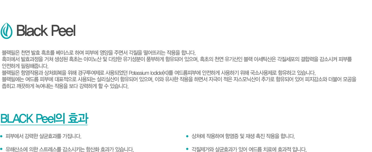 3. Black Peel - ºí·¢ÇÊÀº õ¿¬ ¹ßÈ¿ ÈæÃʸ¦ º£À̽º·Î ÇÏ¿© ÇǺο¡ ¿µ¾çÀ» ÁÖ¸é¼ °¢ÁúÀ» ¶³¾î¶ß¸®´Â ÀÛ¿ëÀ» ÇÕ´Ï´Ù. - Èæ¹Ì¿¡¼ ¹ßÈ¿°úÁ¤À» °ÅÃÄ »ý¼ºµÈ ÈæÃÊ´Â ¾Æ¹Ì³ë»ê ¹× ´Ù¾çÇÑ À¯±â¼ººÐÀÌ Ç³ºÎÇÏ°Ô ÇÔÀ¯µÇ¾î ÀÖÀ¸¸ç, ÈæÃÊÀÇ Ãµ¿¬ À¯±â»êÀÎ ºí·¢ ¾Æ¼¼Æ½»êÀº °¢Áú¼¼Æ÷ÀÇ °áÇÕ·ÂÀ» °¨¼Ò½ÃÄÑ ÇǺθ¦ ¾ÈÀüÇÏ°Ô ÇʸµÇØÁÝ´Ï´Ù. - ºí·¢ÇÊÀº Ç׿°ÀÛ¿ë°ú »óóȸº¹À» À§ÇØ °æ±¸Åõ¿©Á¦·Î »ç¿ëµÇ¾ú´ø Potassium Iodide(KI)¸¦ ¿©µå¸§ÇǺο¡ ¾ÈÀüÇÏ°Ô »ç¿ëÇϱâ À§ÇØ ±¹¼Ò»ç¿ëÁ¦·Î ÇÔÀ¯Çϰí ÀÖ½À´Ï´Ù. - ºí·¢ÇÊ¿¡´Â ¿©µå¸§ ÇǺο¡ ´ëÇ¥ÀûÀ¸·Î »ç¿ëµÇ´Â »ì¸®½Ç»êÀÌ ÇÔÀ¯µÇ¾î ÀÖÀ¸¸ç, ÀÌ¿Í À¯»çÇÑ ÀÛ¿ëÀ» ÇÏ¸é¼ ÀÚ±ØÀÌ ÀûÀº ÀÚ½º¸ð´Ð»êÀÌ Ãß°¡·Î ÇÔÀ¯µÇ¾î ÀÖ¾î ÇÇÁö°¨¼Ò¿Í ´õºÒ¾î ¸ð°øÀ» Á¼È÷°í ±ú²ýÇÏ°Ô ³ì¿©³»´Â ÀÛ¿ëÀ» º¸´Ù °·ÂÇÏ°Ô ÇÒ ¼ö ÀÖ½À´Ï´Ù. BLACK PeelÀÇ È¿°ú ? ÇǺο¡¼ °·ÂÇÑ »ì±ÕÈ¿°ú¸¦ °¡Áý´Ï´Ù. ? À¯ÇØ»ê¼Ò¿¡ ÀÇÇÑ ½ºÆ®·¹½º¸¦ °¨¼Ò½ÃŰ´Â Ç×»êÈ È¿°ú°¡ ÀÖ½À´Ï´Ù. ? »óó¿¡ ÀÛ¿ëÇÏ¿© Ç׿°Áõ ¹× Àç»ý ÃËÁø ÀÛ¿ëÀ» ÇÕ´Ï´Ù. ? °¢ÁúÁ¦°Å¿Í »ì±ÕÈ¿°ú°¡ ÀÖ¾î ¿©µå¸§ Ä¡·á¿¡ È¿°úÀû ÀÔ´Ï´Ù.